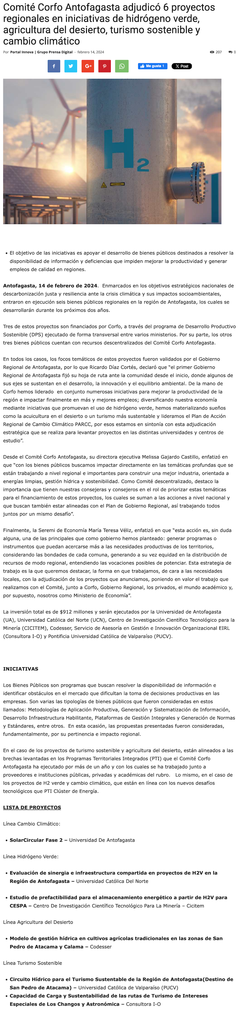 Corfo adjudica proyectos de hidrógeno y cambio climático - (El Mercurio de Antofagasta)