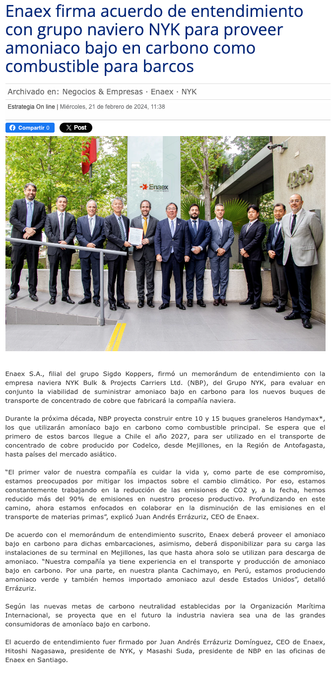 Enaex acuerda con NYK por amoníaco bajo en emisiones - (El Mercurio de Santiago)