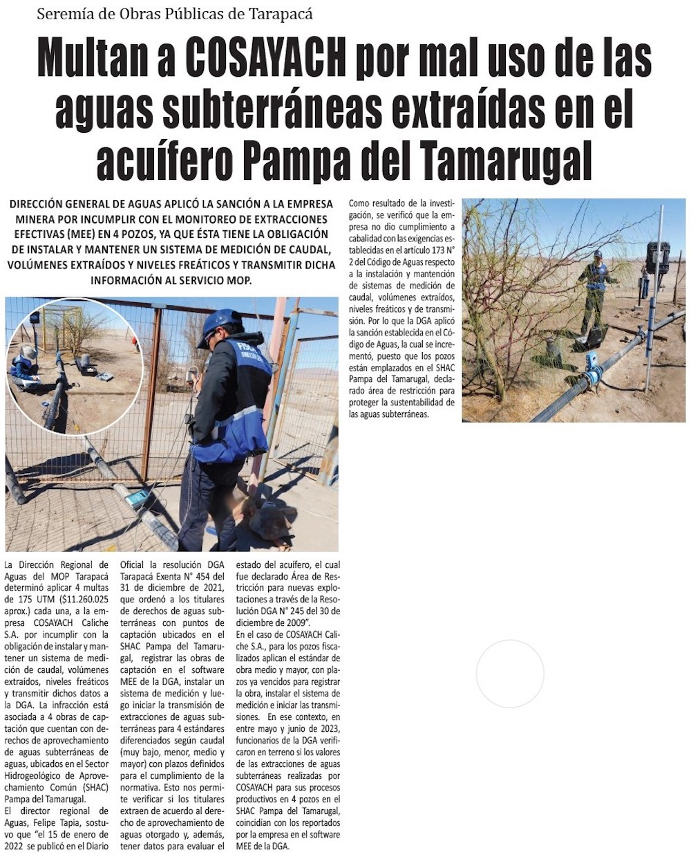 Multan a COSAYACH por mal uso de las aguas subterráneas extraídas en el acuífero Pampa del Tamarugal - (El Longino de Iquique)