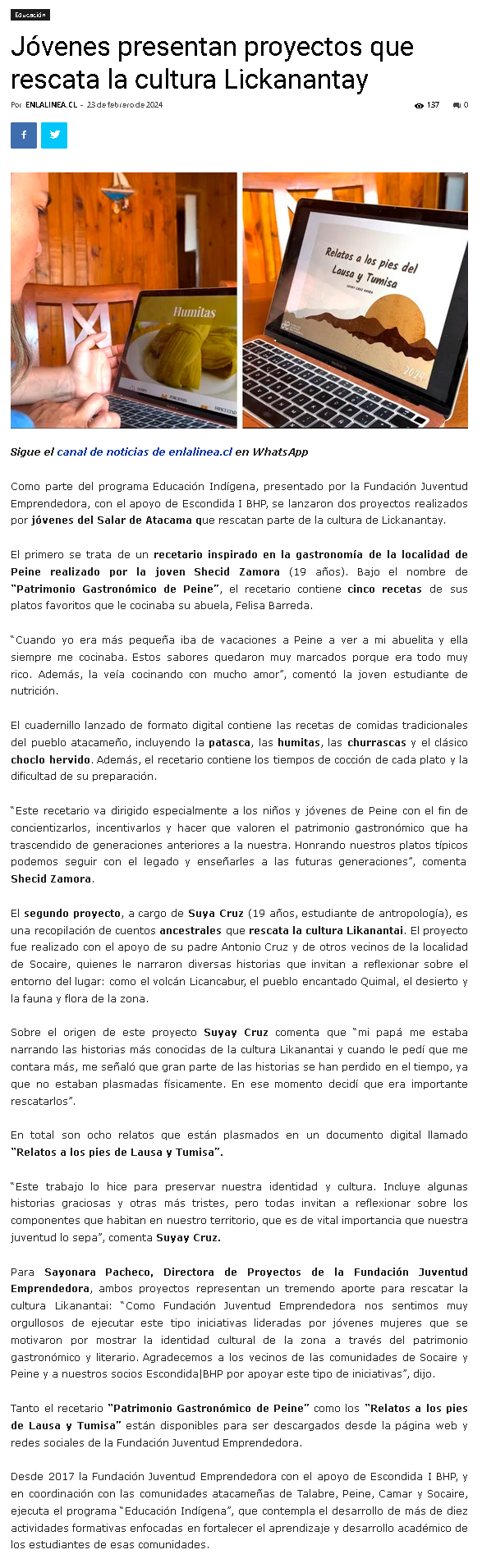Jóvenes presentan proyectos que rescata la cultura likanantai - (calamaenlinea.cl)