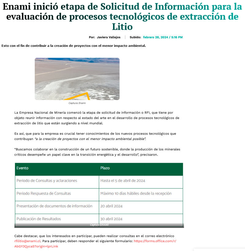 Enami inicia etapa de Solicitud de Información para evaluación de procesos de extracción de litio - (mch.cl)