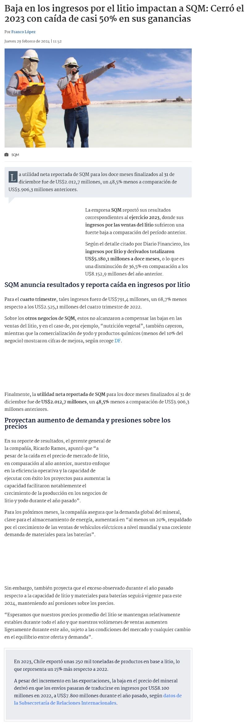 SQM: Precio del litio baja 73% en el cuarto trimestre de 2023 - (El Mercurio de Antofagasta)