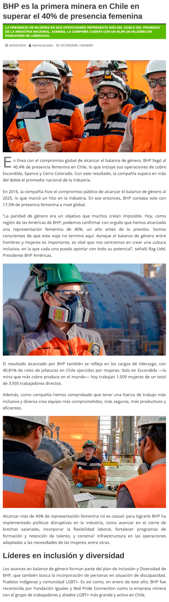 BHP es la primera minera en Chile en superar el 40% de presencia femenina - (El Mercurio de Antofagasta)