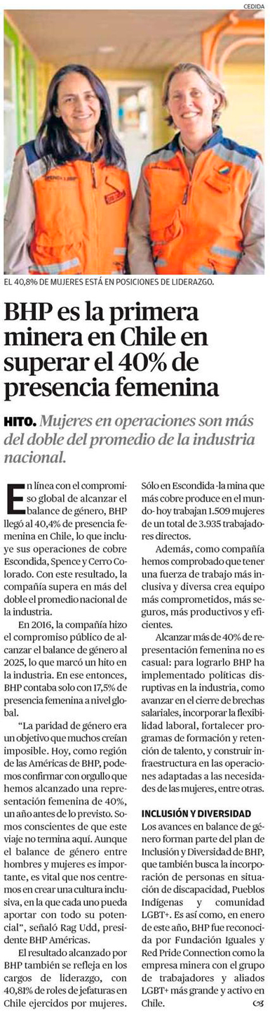 BHP es la primera minera en Chile en superar el 40% de presencia femenina - (El Mercurio de Antofagasta)