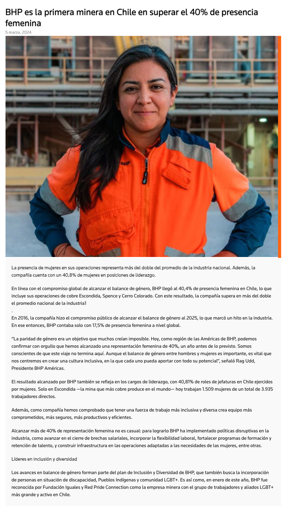 BHP se convierte en la primera compañía minera en Chile en alcanzar el 40% de participación femenina - (mineriayfuturo.cl)