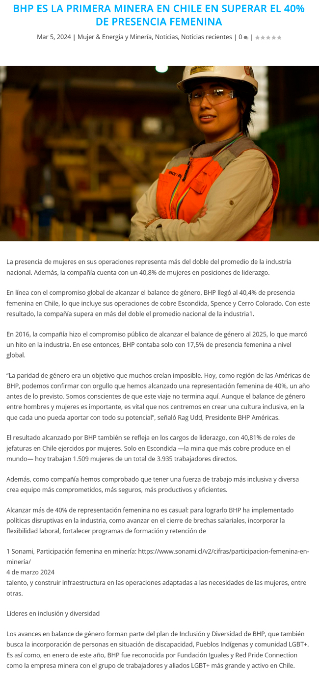 BHP se convierte en la primera compañía minera en Chile en alcanzar el 40% de participación femenina - (mineriayfuturo.cl)