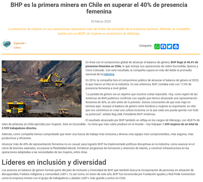 BHP se convierte en la primera compañía minera en Chile en alcanzar el 40% de participación femenina - (mineriayfuturo.cl)