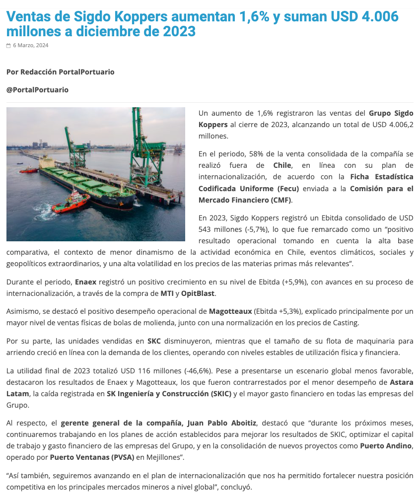 Ganancias de Sigdo Koppers caen casi 50% en 2023 ante débil desempeño de algunas operaciones - (Diario Financiero)