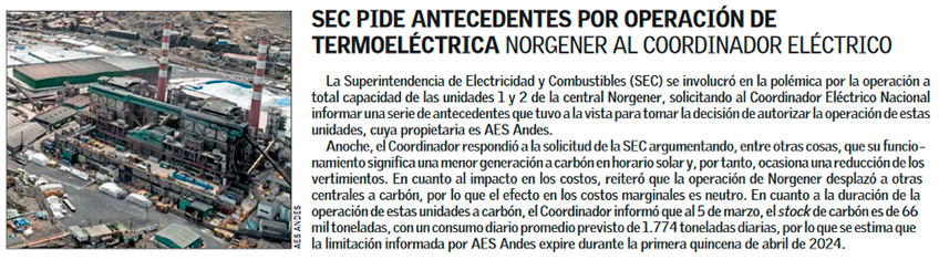 Coordinador entrega detalles a la SEC por operación de Norgener y estima que las restricciones durarán hasta abril - (Diario Financiero)