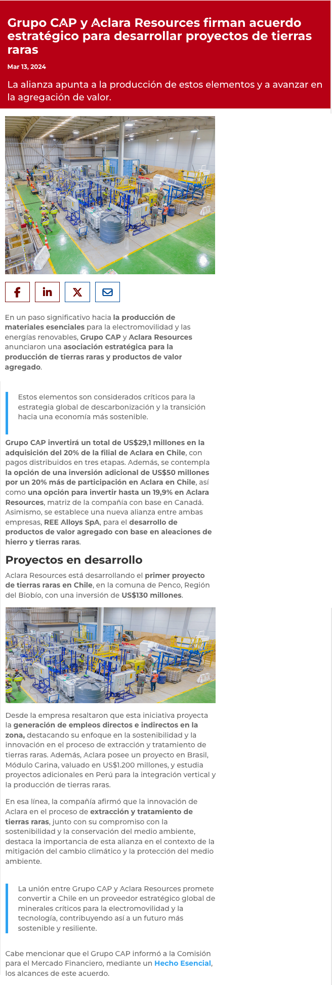 CAP entra a proyecto de tierras raras en Penco: adquiere 20% y opción de ingresar a Brasil - (Diario Financiero)