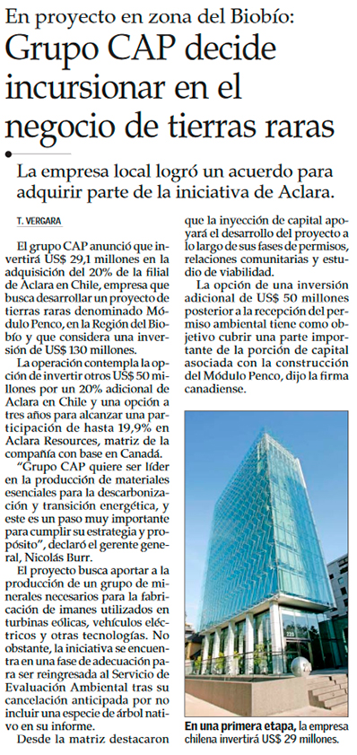Grupo CAP y Aclara Resources firman acuerdo estratégico para desarrollar proyectos de tierras raras - (mch.cl)