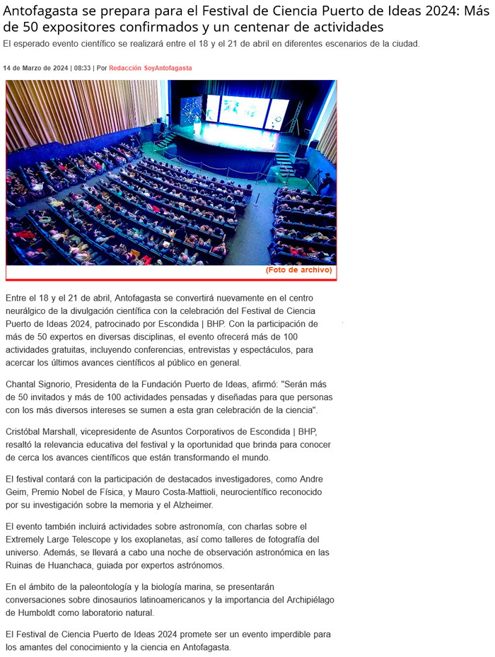 Los enigmas de la naturaleza, los secretos de la mente humana y las nuevas formas de observar el universo marcarán las actividades del Festival de Ciencia Puerto de Ideas Antofagasta 2024 - (g5noticias.cl)