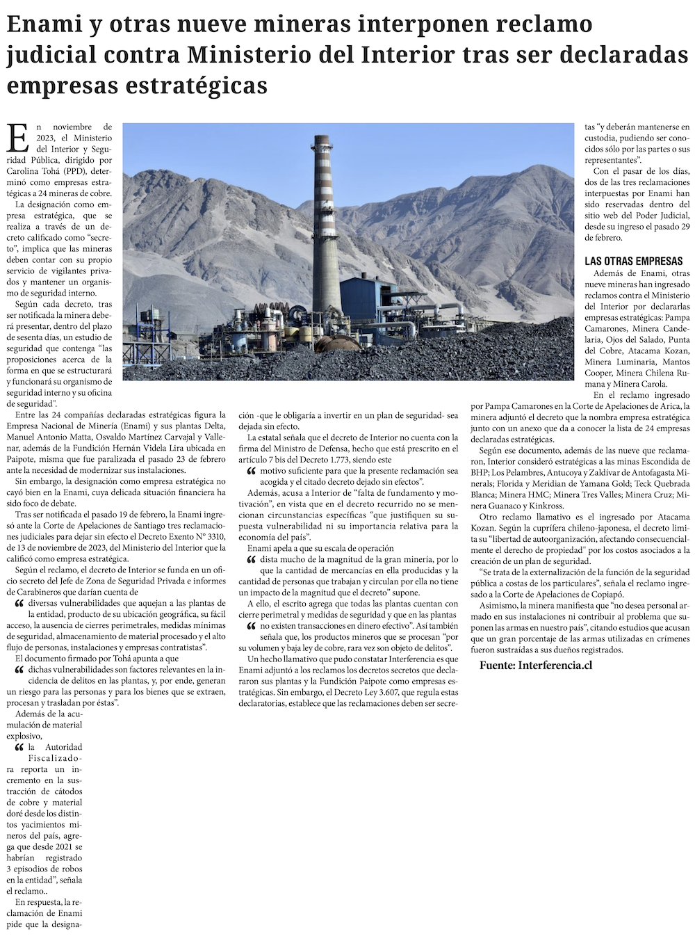 Enami y mineras presentan recurso de protección contra Interior - (radioamigavallenar.cl)