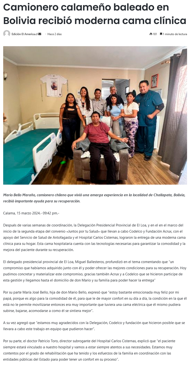 Entregaron moderna cama clínica para la recuperación de camionero Mario Bello - (El Mercurio de Calama)