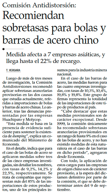 Comisión Antidistorsiones recomienda al Gobierno aplicar sobretasas a bolas y barras de acero chino - (Diario Financiero)