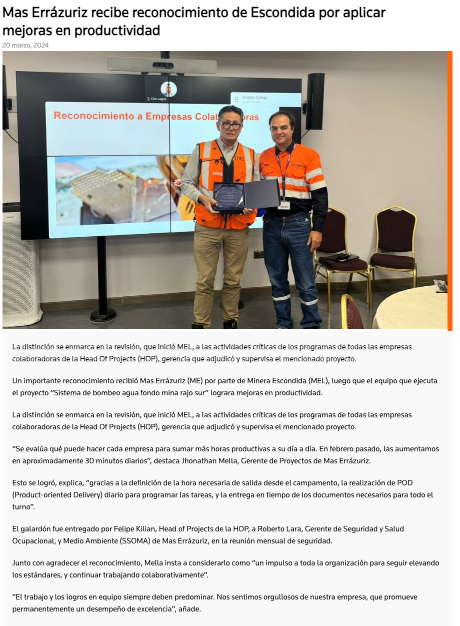 Mas Errázuriz recibe reconocimiento de Escondida por aplicar mejoras en productividad - (mvcomunicaciones.cl)