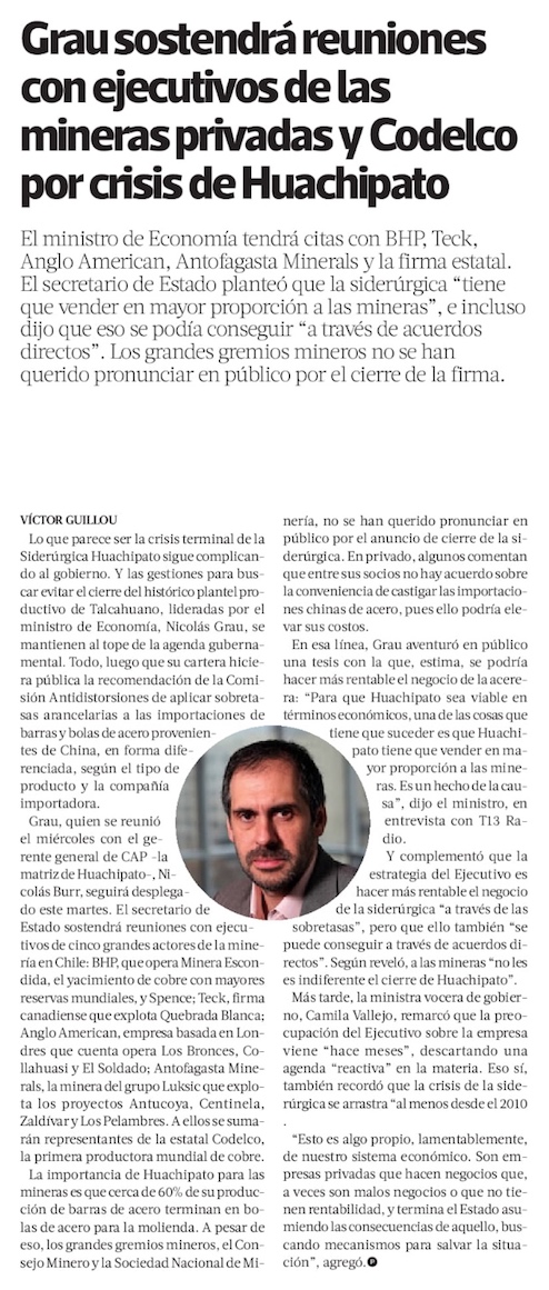 Ministro Grau se reunirá con mineras para que compren más acero a Huachipato y a un mejor precio - (Diario Financiero)