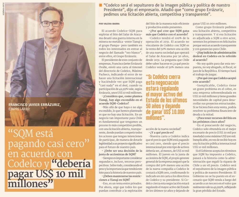 Francisco Javier Errázuriz: “Pacto Codelco/SQM es un saqueo que daña a empresarios y a la política” - (El Mostrador)