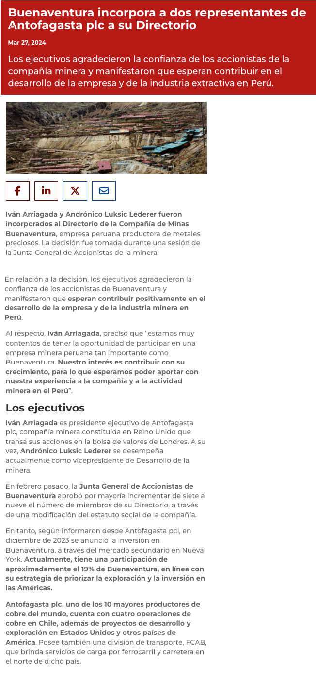 “Sin sorpresas”: Andrónico Luksic Lederer e Iván Arriagada ingresan al directorio de Buenaventura - (Diario Financiero)