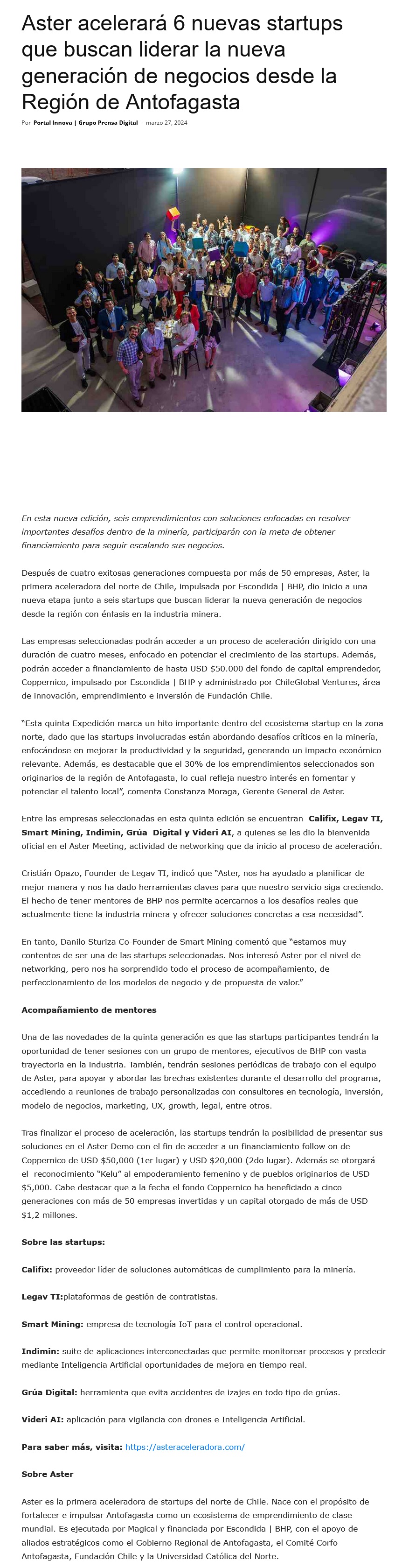 Aster acelerará 6 nuevas startups que buscan liderar la nueva generación de negocios desde la Región de Antofagasta - (news.eseuro.com)