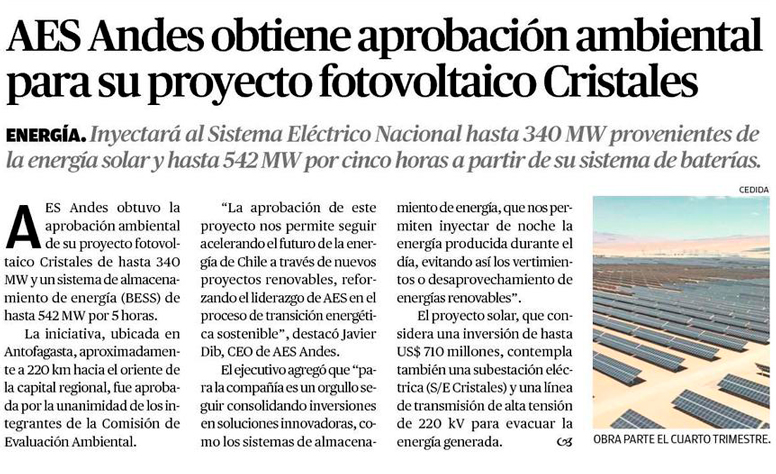 AES Andes obtiene aprobación ambiental para proyecto Cristales - (Pulso)