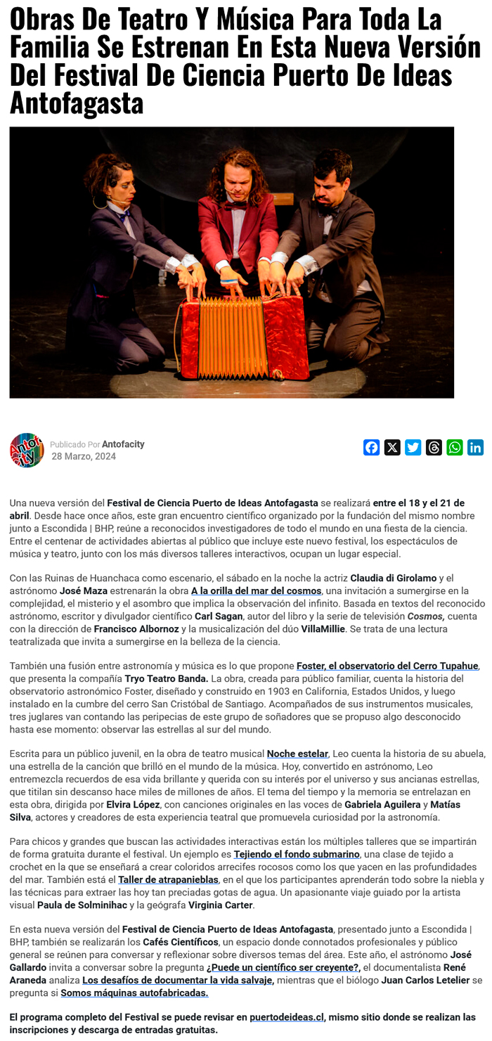 Obras de teatro y música para toda la familia se estrenan en esta nueva versión del Festival de Ciencia Puerto de Ideas Antofagasta - (regionesnoticias.cl)