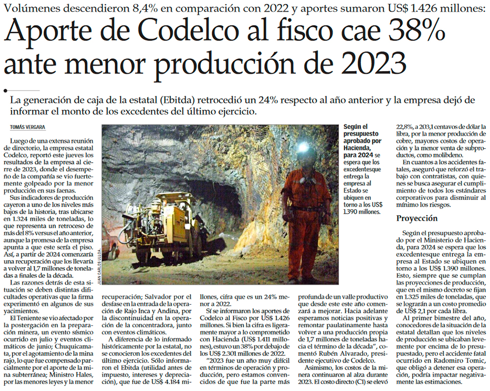 Producción de Codelco baja 8,4% durante 2023 y cae 38% su aporte fiscal - (El Mercurio de Antofagasta)