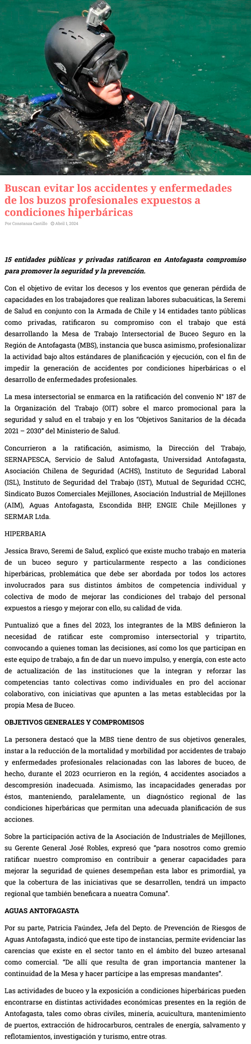 Buscan evitar los accidentes y enfermedades de los buzos profesionales expuestos a condiciones hiperbáricas - (diarioangamos)