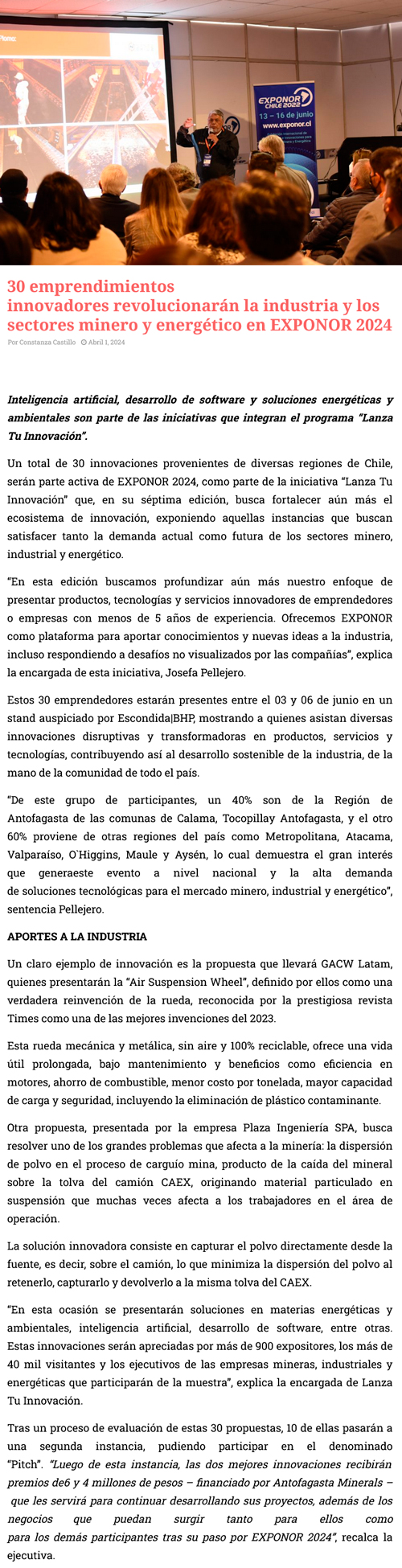 30 emprendimientos innovadores revolucionarán la industria y los sectores minero y energético en EXPONOR 2024 - (mvcomunicaciones.cl)