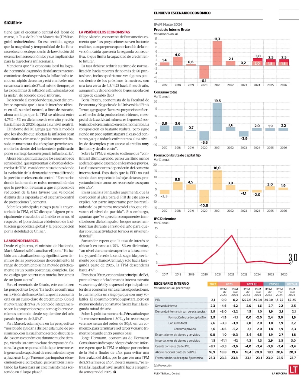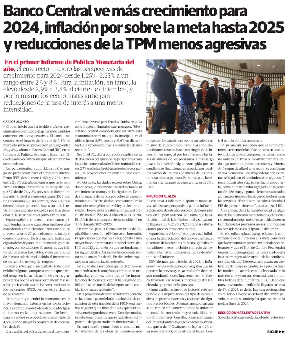 Pese a mayor PIB en 2024, el Banco Central prevé alza inflacionaria, débil inversión y riesgo crediticio - (El Mercurio de Santiago)