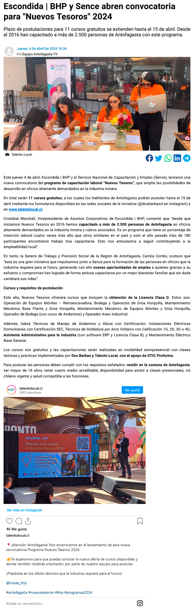 Escondida| BHP y Sence abren nueva convocatoria para curso gratuitos de alta demanda en la industria minera - (antofagastaonline.cl)