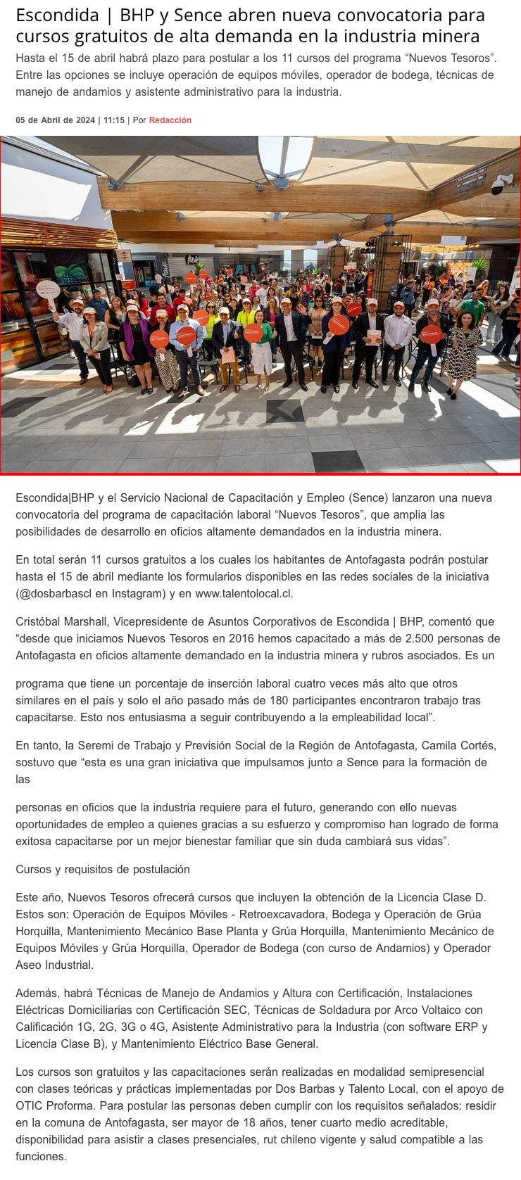 Escondida | BHP y Sence abren nueva convocatoria para cursos gratuitos de alta demanda en la industria minera - (timeline)
