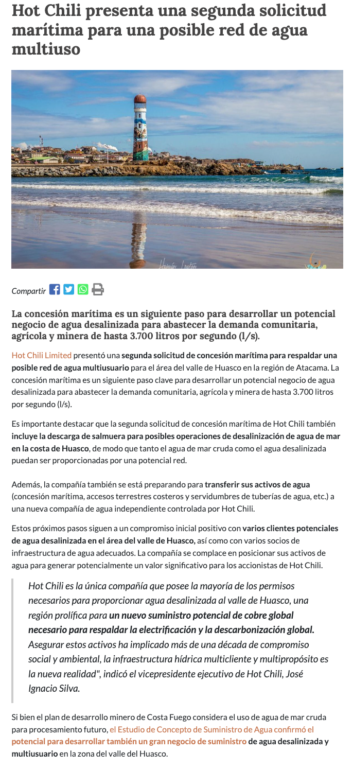Hot Chili Limited avanza con solicitud de concesión marÃtima para proyecto de agua en Huasco - (madero.cl)
