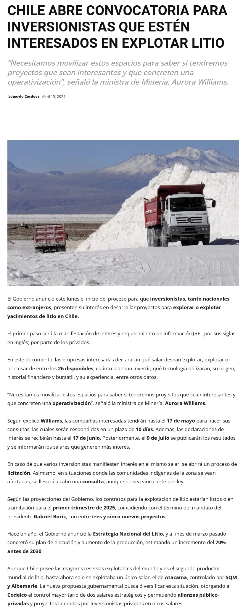 Gobierno busca otorgar primeros Contratos Especiales de Operación de Litio (CEOLes) a fines de este año - (El Mercurio de Santiago)