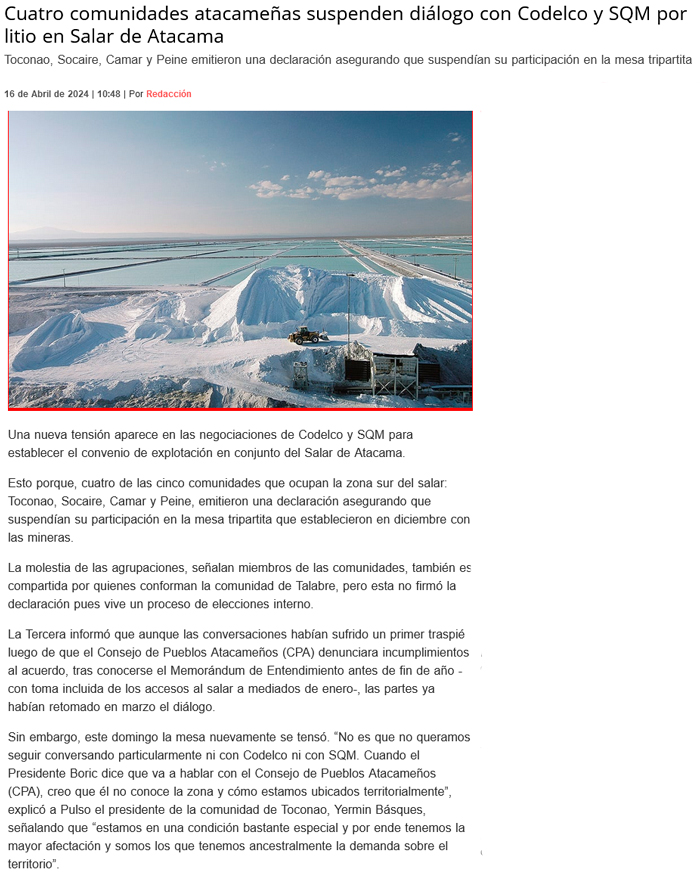 Cuatro comunidades indígenas del Salar de Atacama suspenden diálogo con SQM y Codelco por litio - (terram.cl)