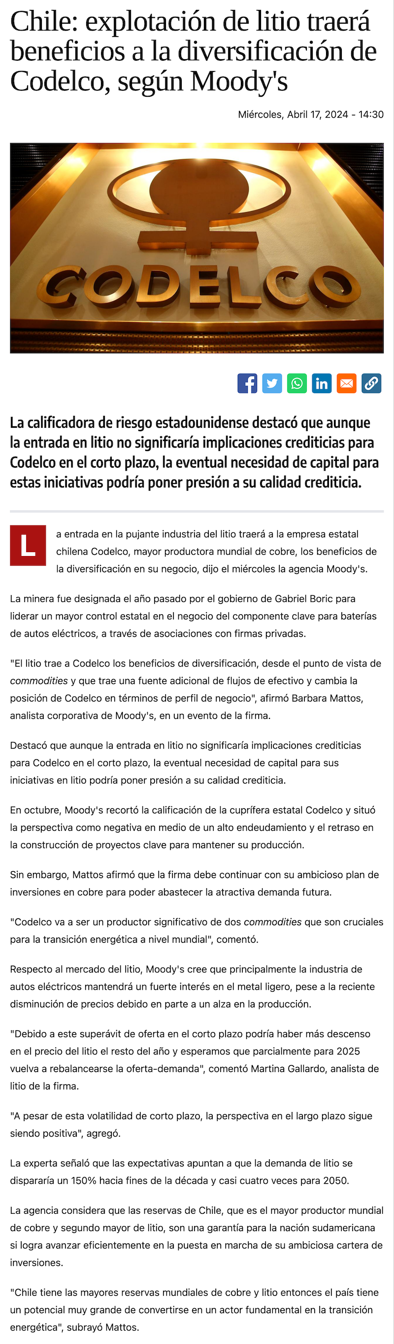 Moody´s dice que el litio traerá beneficios de diversificación a Codelco - (La Tercera Online)