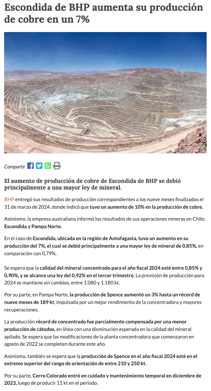Escondida aumenta su producción en el primer trimestre por una mayor ley - (nuevaminería online)