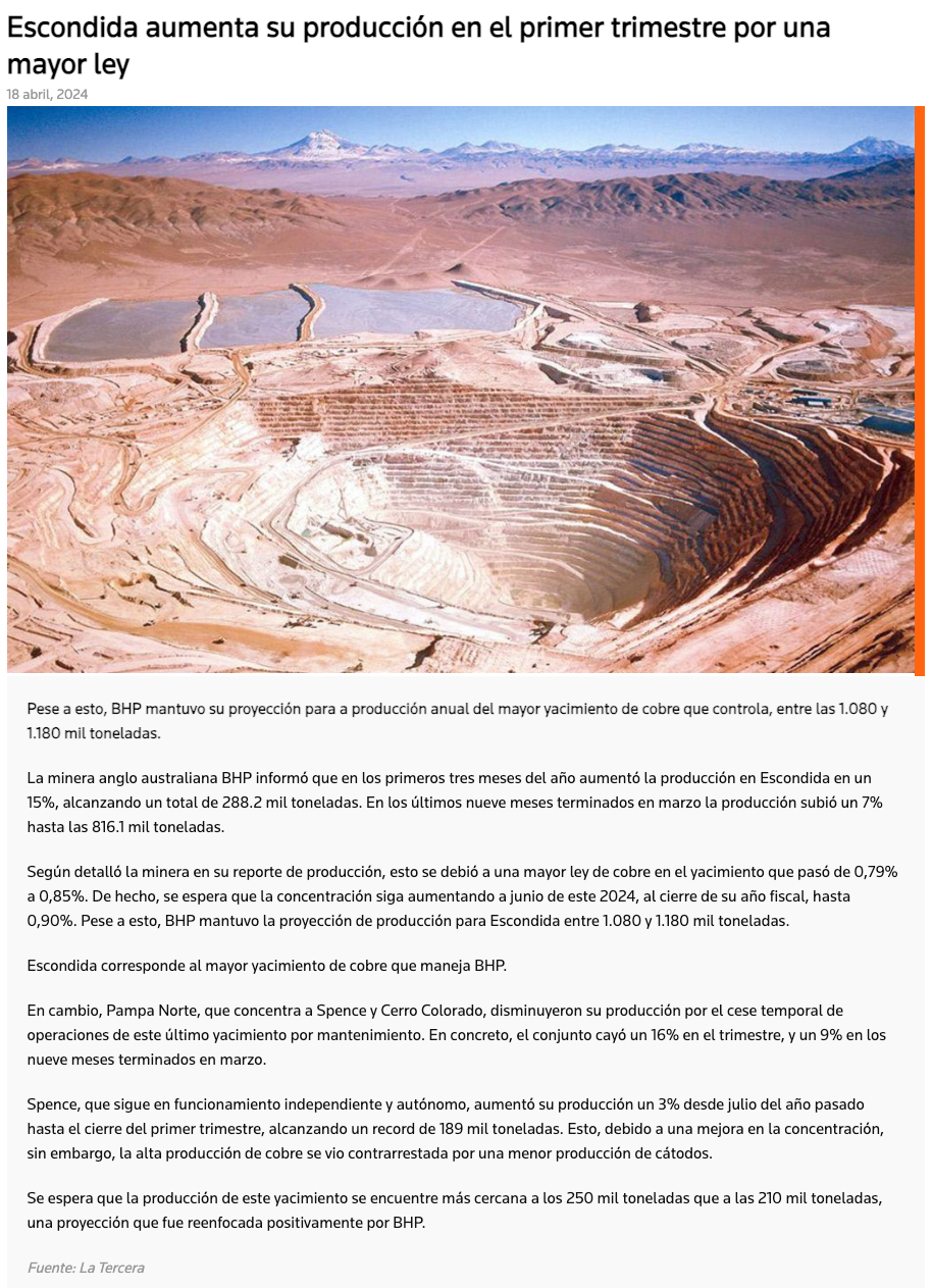 Escondida aumenta su producción en el primer trimestre por una mayor ley - (redimin)