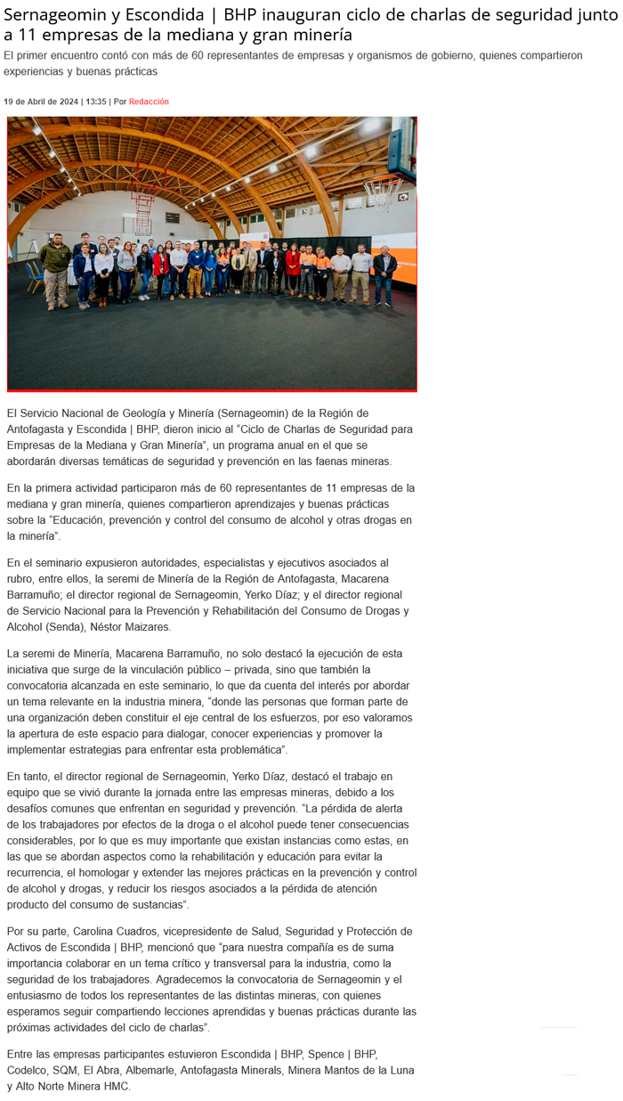 Sernageomin y Escondida BHP inauguran ciclo de charlas de seguridad junto a 11 empresas de la mediana y gran minería - (El Mercurio de Antofagasta)