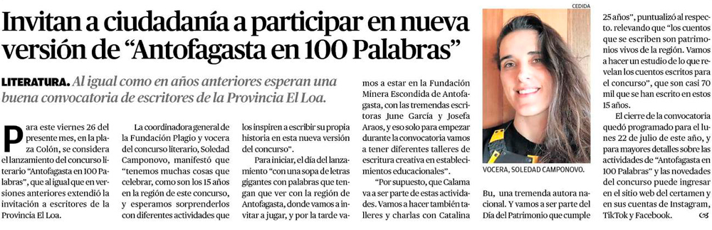 Invitan a ciudadanÃa a participar en nueva versión de "Antofagasta en 100 Palabras" - (El Mercurio de Calama)