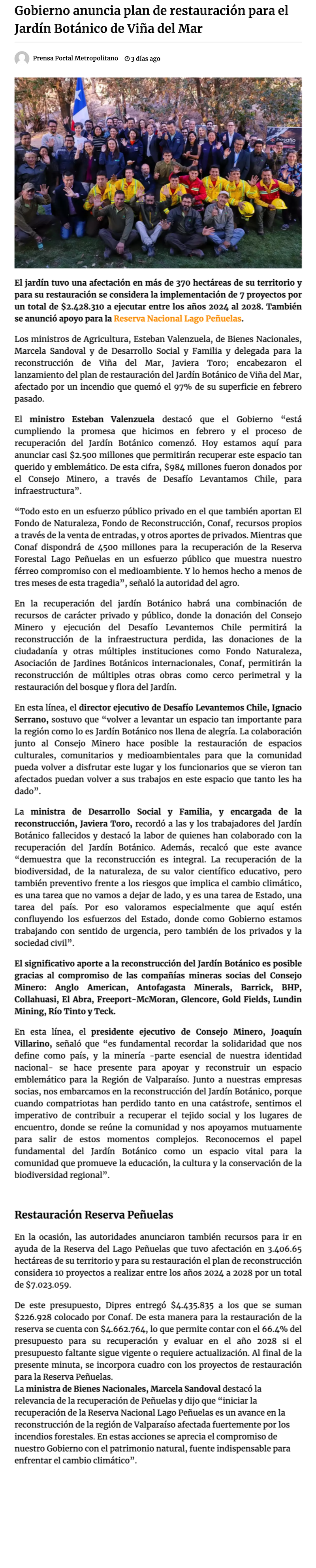 Empresas socias del Consejo Minero apoyarán reconstrucción del Jardín Botánico Nacional - (mch.cl)