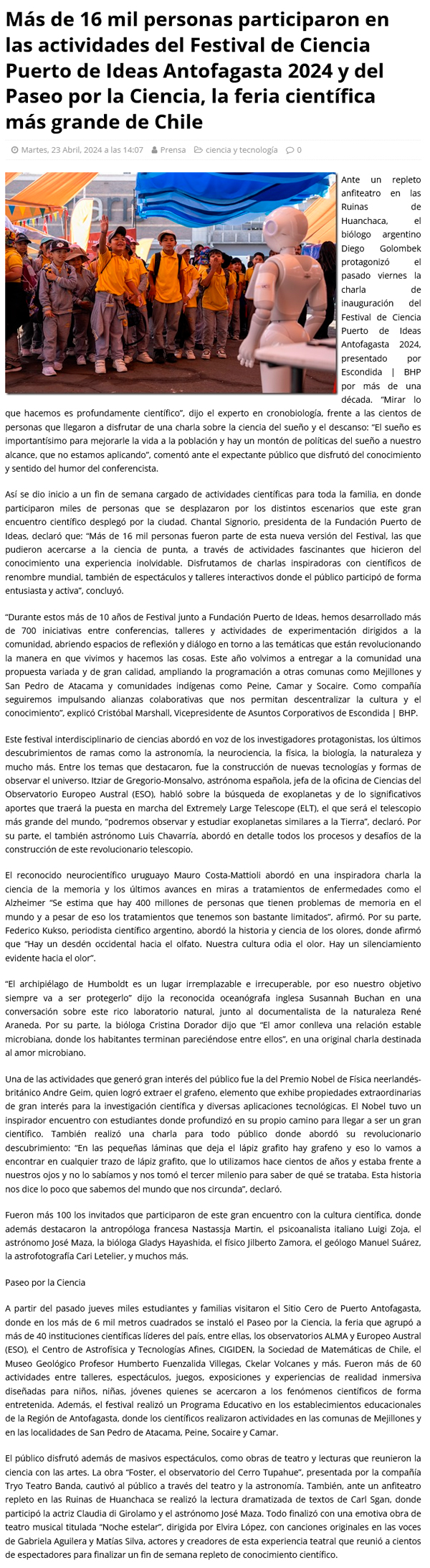 Más de 16 mil personas participaron en las actividades del Festival de Ciencia Puerto de Ideas Antofagasta 2024 y del Paseo por la Ciencia, la feria científica más grande de Chile - (regionesnoticias.cl)
