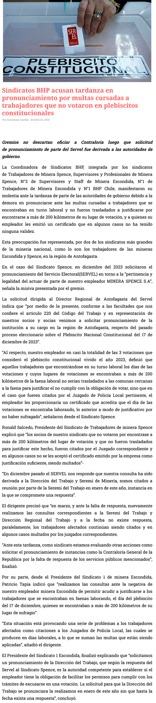 Sindicatos BHP denuncian demoras en resolución de multas cursadas a mineros que no votaron en plebiscitos constitucionales - (soyantofagasta)