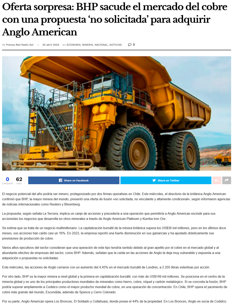 BHP, operadora de Escondida, hace oferta de megafusión con Anglo American: Quedaría como la mayor productora de cobre del mundo por sobre Codelco - (soyantofagasta)