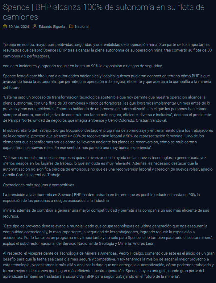 Spence | BHP alcanza 100% de autonomÃa en su flota de camiones y perforadoras - (soyantofagasta)