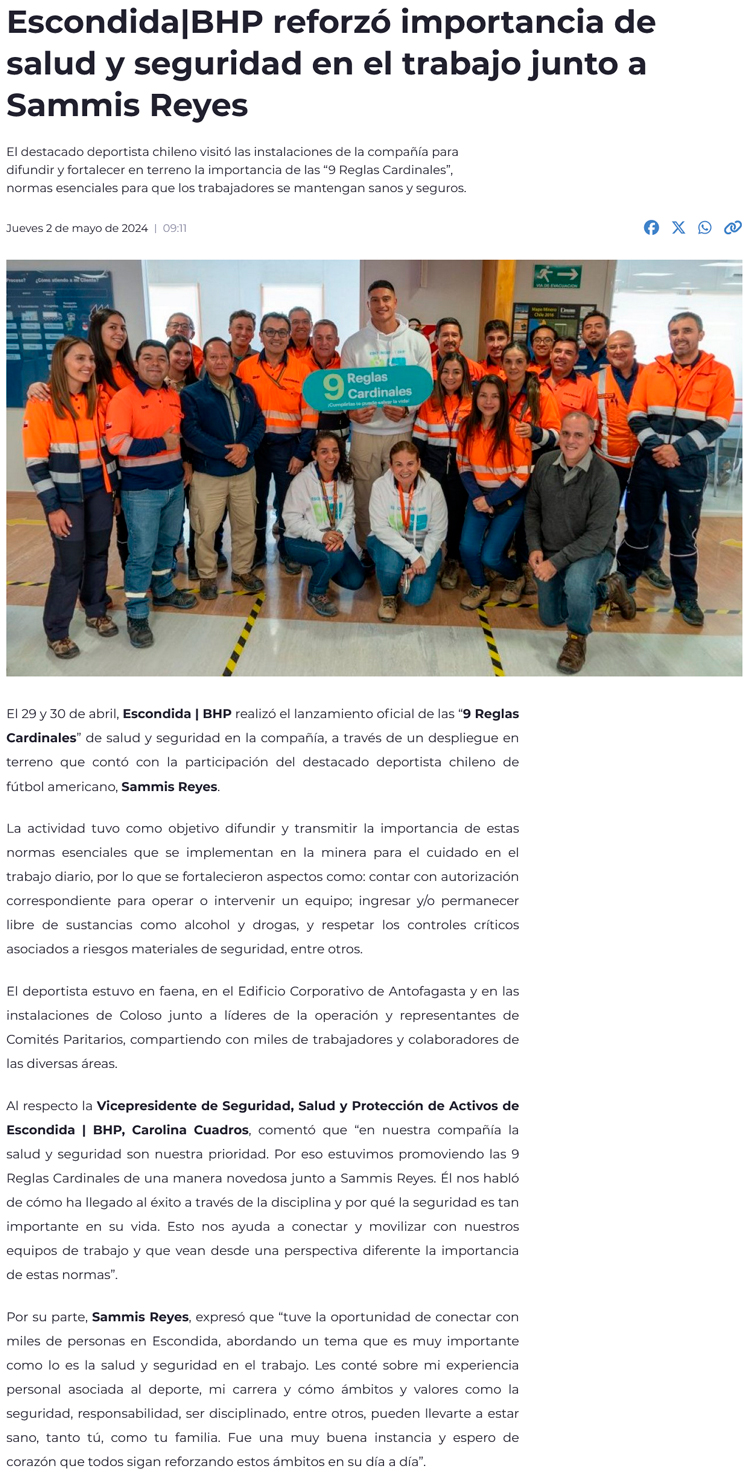 Escondida | BHP reforzó la importancia de la salud y seguridad en el trabajo junto al deportista nacional Sammis Reyes - (nuevaminería online)