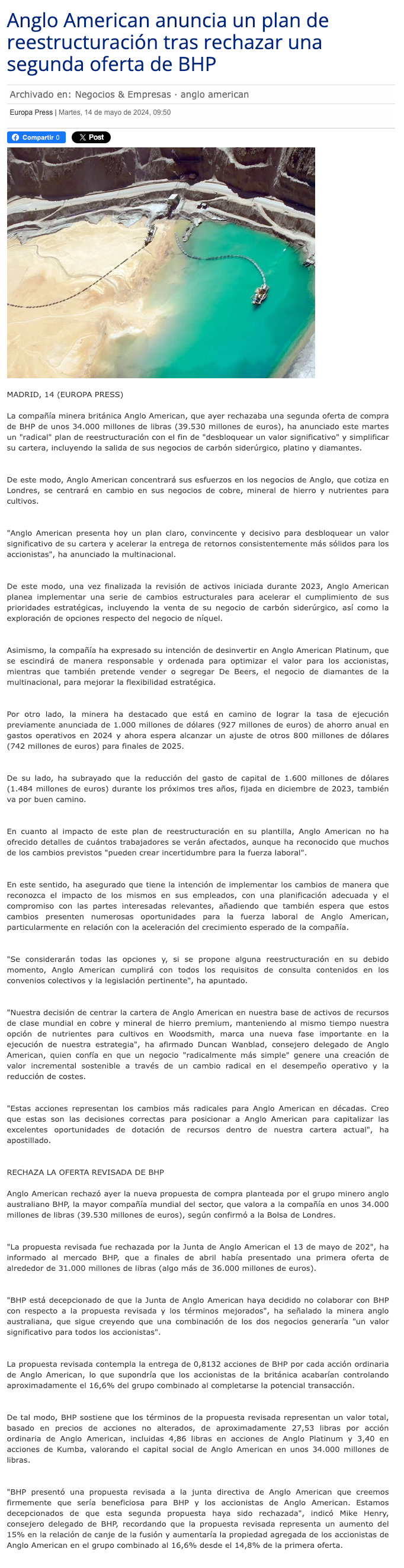 Anglo American anuncia nuevo foco de desarrollo con el cobre y el hierro como ejes - (El Mercurio de Santiago)