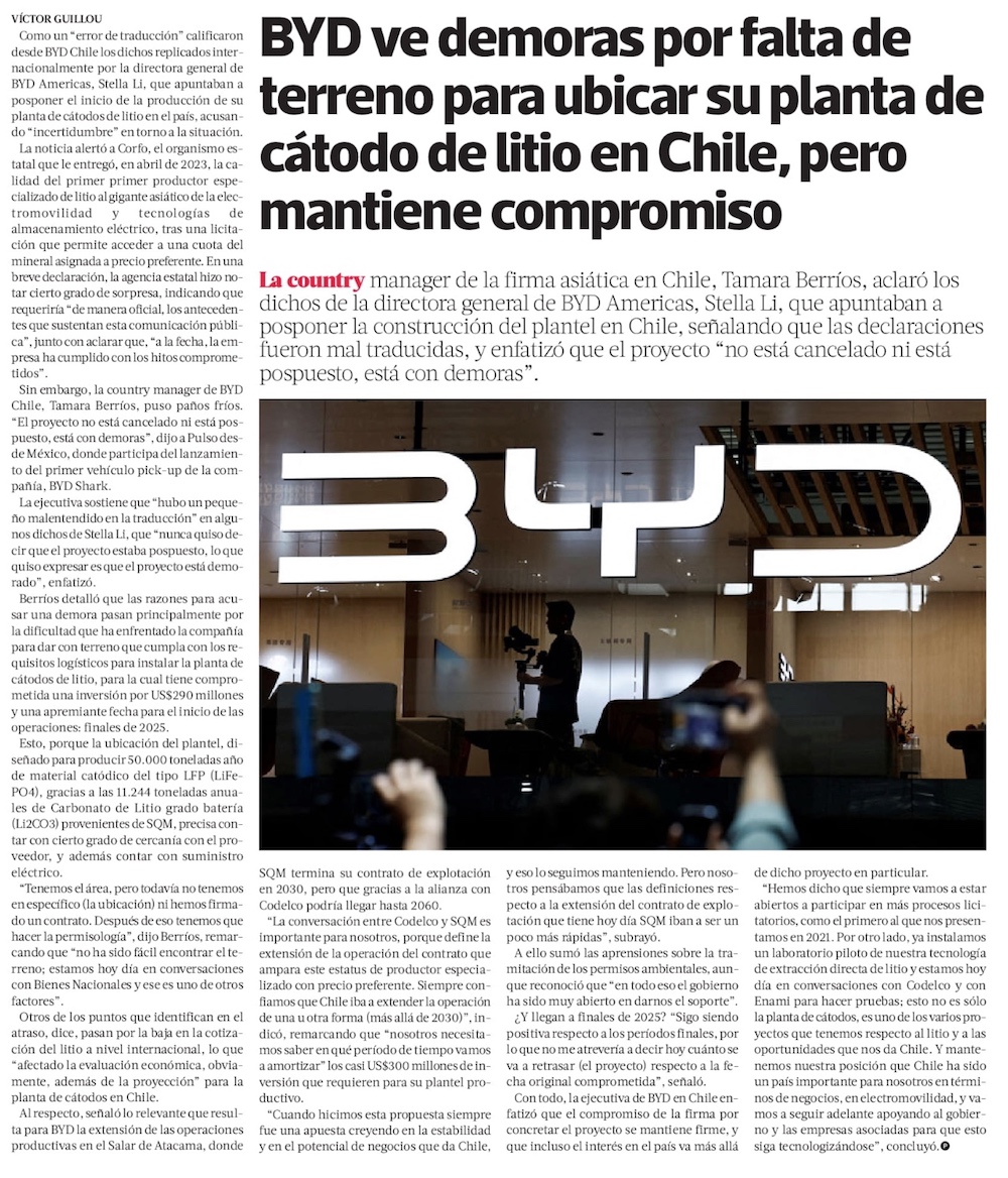 BYD pospone inicio de producción de planta de cátodos de litio en Chile por incertidumbre y Corfo solicita antecedentes - (La Tercera Online)