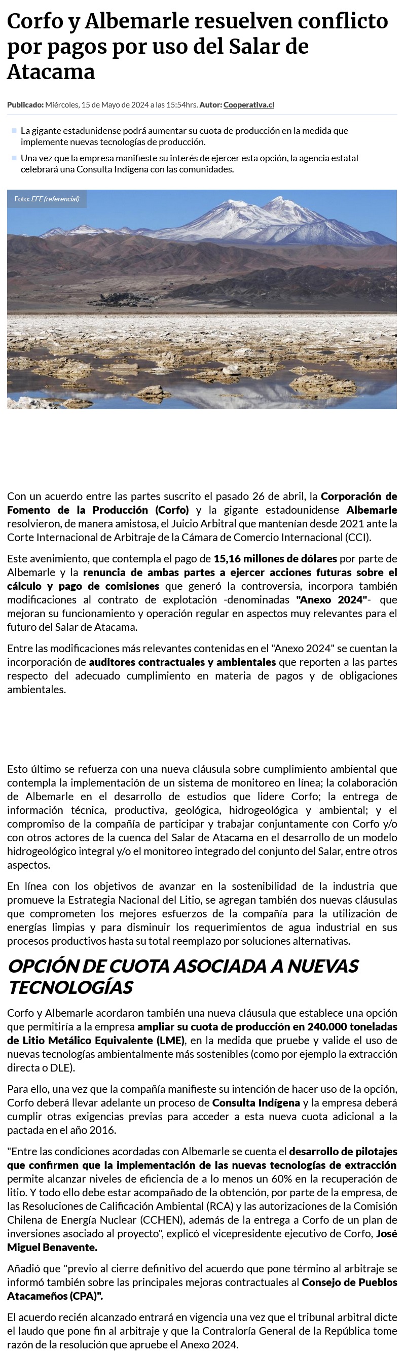 Corfo y Albemarle resuelven amistosamente el juicio arbitral que mantenían desde el 2021 - (El Mercurio de Antofagasta)