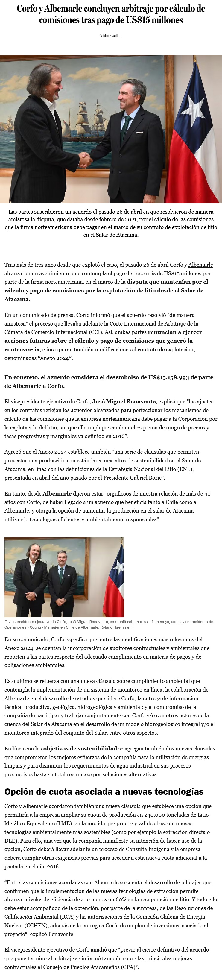 Corfo y Albemarle resuelven amistosamente el juicio arbitral que mantenían desde el 2021 - (El Mercurio de Antofagasta)